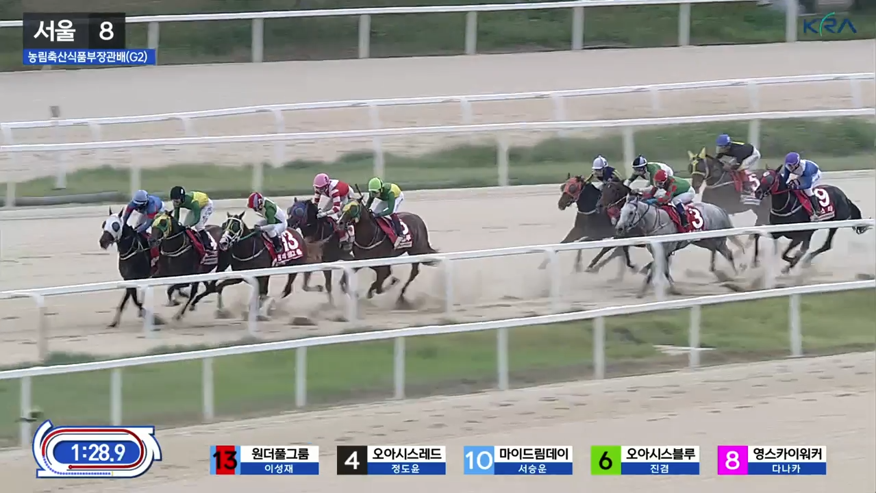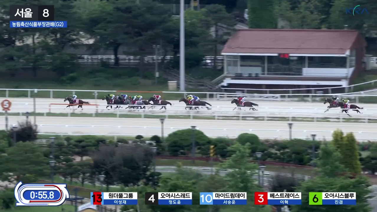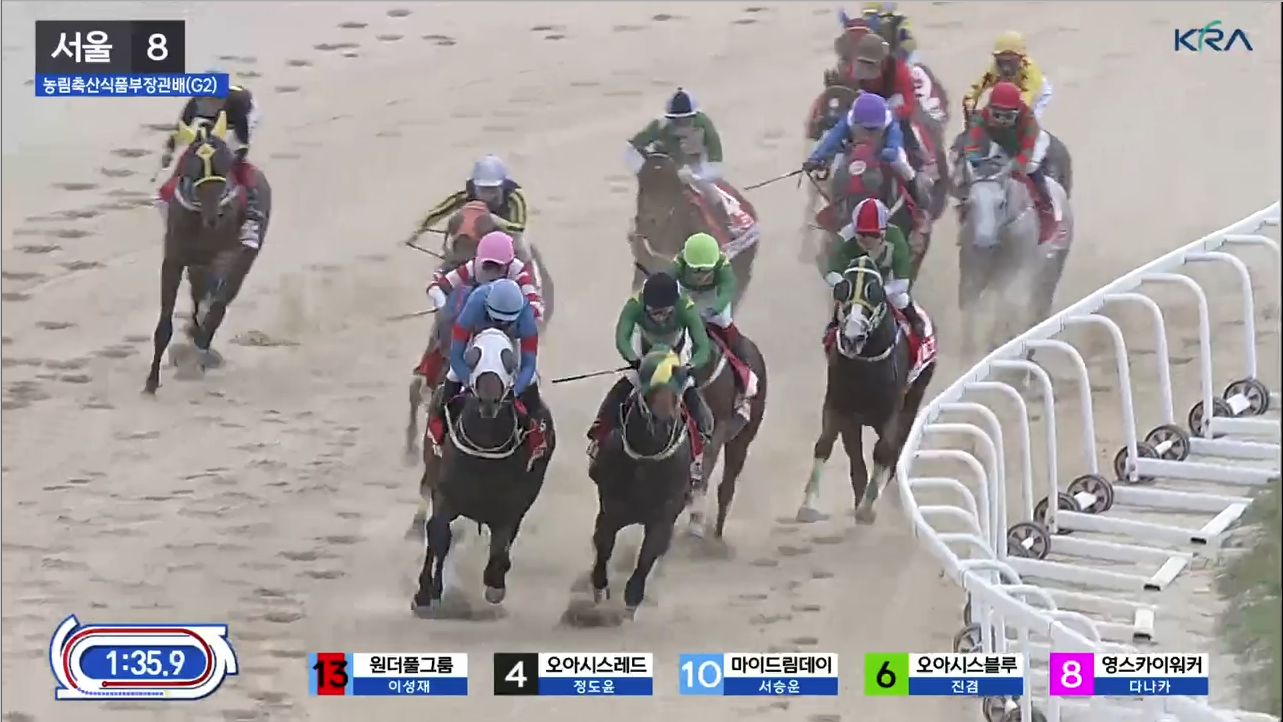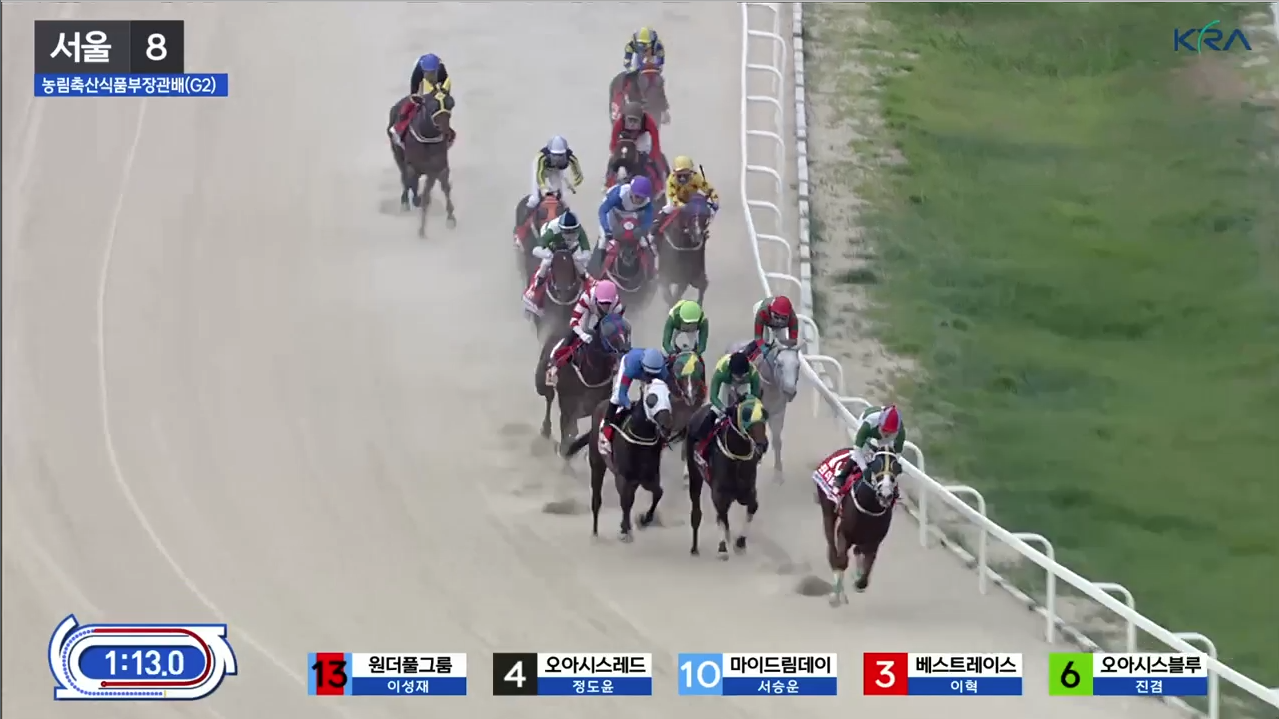 출발 신호와 함께 3번 베스트레이스가 선두를 잡았으나, 곧 13번 원더풀그룸이 외곽에서 감아들며 선두를 빼앗았습니다. 3코너 중반까지 원더풀그룸이 단독 선두를 지켰고, 오아시스블루는 선두권 뒤 안쪽에 위치하며 8번 영스카이워커에게 압박을 받았습니다. 마이드림데이는 2선 가장 외곽에서, 스톰파이터는 후미에서 경주를 진행하다가 3코너를 지나며 중간 그룹으로 올라왔습니다.