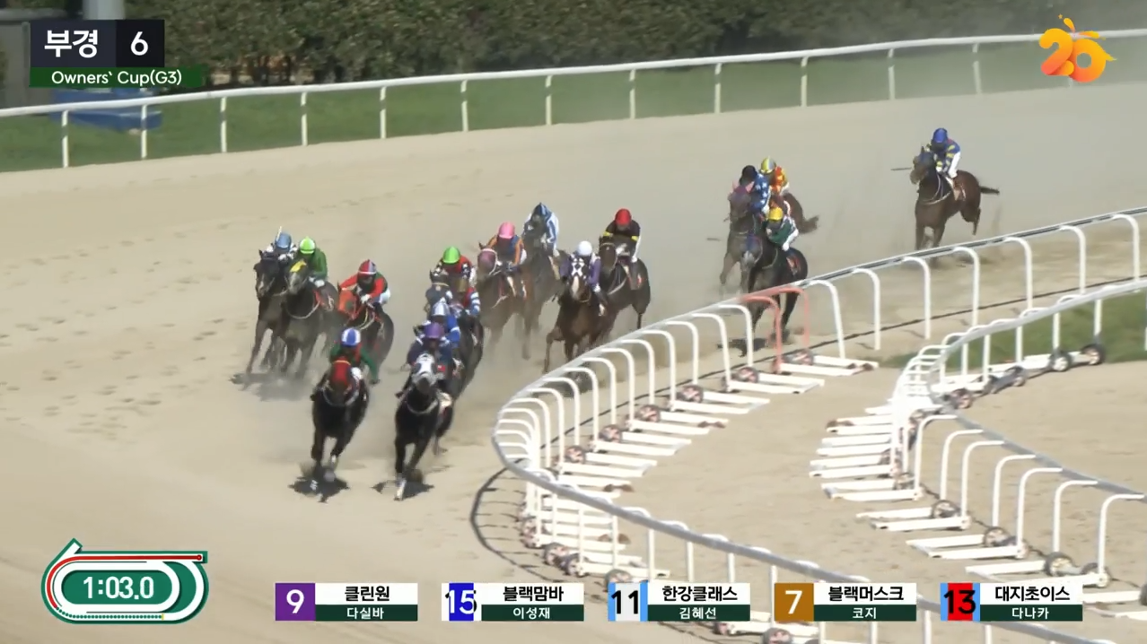 특히 15번 블랙맘바는 외곽 게이트 불리함 속에서도 선두권 진입을 시도했지만, 9번 클린원이 안쪽 유리함을 살려 초반부터 강하게 압박했고, 결국 두 마리의 경합은 4코너를 돌아 직선 주로에 들어설 때까지도 계속됐다.